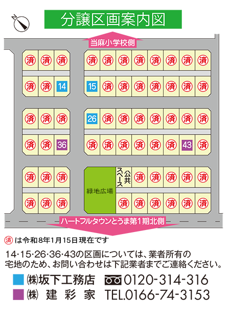 | 受付方法 | 分譲申込書に必要事項を記入、押印のうえ 当麻町土地開発公社事務局(役場まちづくり 推進課)へ提出 |